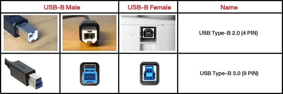 มีหลายประเภทของ USB Type-B ซึ่งแตกต่างกันตามขนาดและการใช้งาน เช่น USB Type-B Standard ที่มักใช้สำหรับเครื่องพิมพ์และเครื่องสแกน และ USB Type-B Mini ที่มีขนาดเล็กกว่าและมักใช้สำหรับอุปกรณ์เคลื่อนที่เช่น กล้องถ่ายภาพดิจิตอล โทรศัพท์มือถือแบบเก่า และอุปกรณ์อื่นๆ