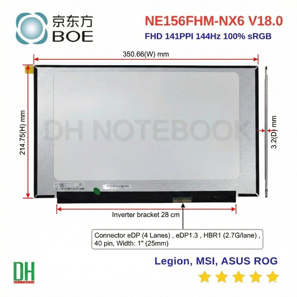 หน้าจอ NE156FHM-NX6 แบบ Oxide TFT-LCD ขนาด 15.6 นิ้ว ความละเอียด FHD IPS รีเฟรชเรต 144Hz คอนเนคเตอร์ eDP 40pin เหมาะสำหรับเปลี่ยนในโน๊ตบุ๊คเกมมิ่ง เช่น Legion, MSI, ASUS ROG ตรวจสอบพินและรหัสรุ่นก่อนสั่งซื้อ